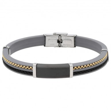 Pulsera para Hombre . Es una pulsera original de la marca Liska , para hombre de la colección Urban. Es un modelo elaborado en caucho gris con adornos en acero antialérgico e inoxidable en color plateado y dorado. La longitud de la correa es de aproximadamente unos 21 cm y el cierre es de tipo seguridad. Ancho de 8,00 mm