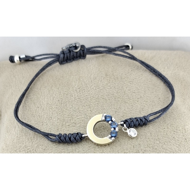 Pulsera para mujer fabricado en plata de 1ª ley 925 mls y oro de 9 kts , orla con piedra calcedonia azul y abalorio colgate mini de circonita blanca, orla de 10,70 mm de diámetro , terminado con hilo de rayón ajustable a la medida