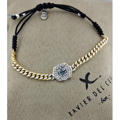 Pulsera para mujer fabricado en plata de 1ª ley 925 mls y oro de 9 kts ,pulsera hexagonal con circonitas blancas y piedra central rectangular verde , con cadena barbada en chapado en oro amarillo lapidado para darle brillo y terminado con hilo de rayón ajustable a la medida