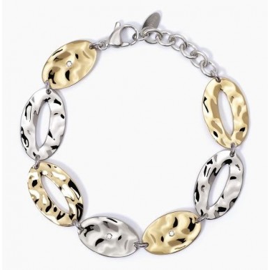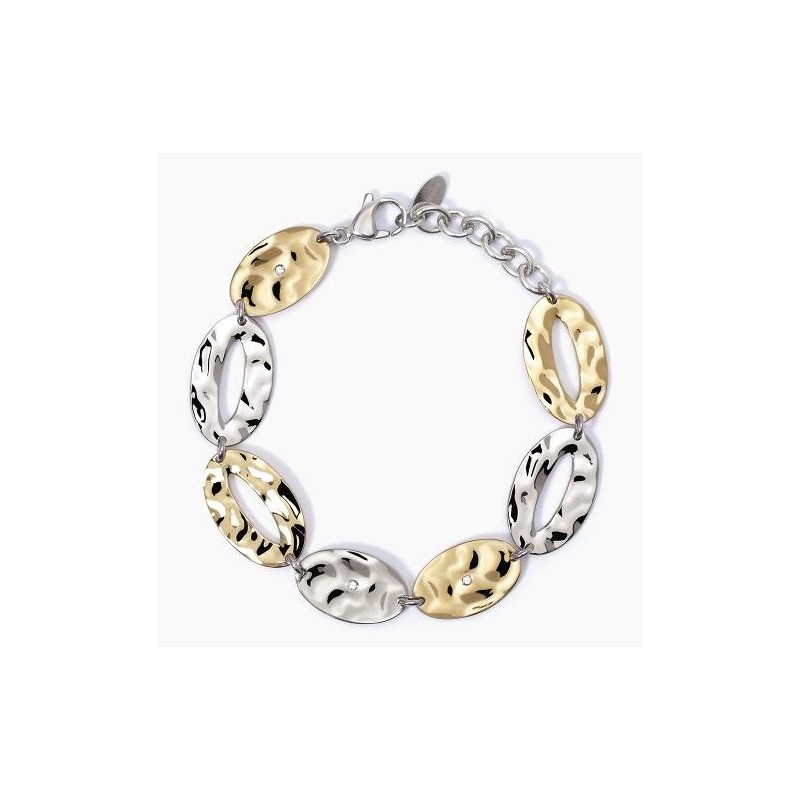 Pulsera de acero 316L con elementos ovales martillados 19×11 mm y 22×13 mm, elementos ovales martillados con PVD dorado 19×11 mm y 22×13 mm y cristales Ø 1.5 mm, longitud ajustable de 16 a 19 cm
