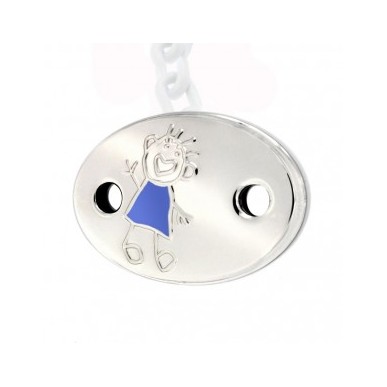 Pinza chupete para bebe ovalada . Realizada en Plata de 1ªLey 925MLS. Pinza trasera de plástico blanco y cadena de plástico del mismo color. Lacada para evitar alergias y con dos orificios para evitar la asfixia en caso de accidente. Modelo TOTO con esmalte en color azul , medidas 47x32 mm