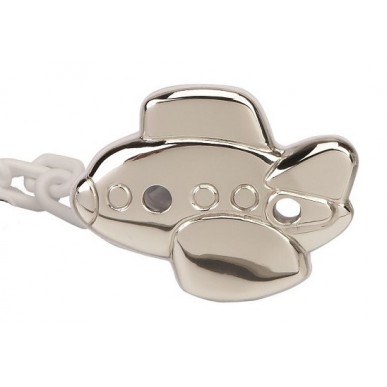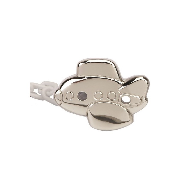 Pinza chupete para bebe AVION . Realizada en Plata de 1ªLey 925MLS. Pinza trasera de plástico blanco y cadena de plástico del mismo color. Lacada para evitar alergias y con dos orificios para evitar la asfixia en caso de accidente.
