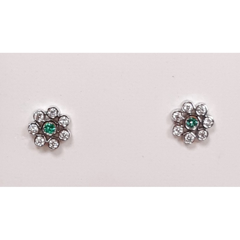 Pendientes de bebé en oro blanco de 1ª ley 750mls en forma de flor con diamantes en los pétalos con un peso total de 0,07cts y una piedra esmeralda en el centro y la medida del pendiente es 4.80mm de diámetro y cierre a rosca