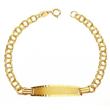 Pulsera para bebé modelo nomeolvides en oro amarillo de 1ª ley 18ktes 750mls medida de largo 13cm , la plaquita se puede grabar y la medida es de 16x4.5mm. cierre de reasa.