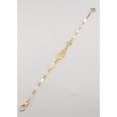 Pulsera para bebé en oro amarillo de 1ªley 18 ktes 750mls , medida de largo 14,50 cm , con plaquita en forma de nube para grabar y con dos flores laterales cierre con reasa.