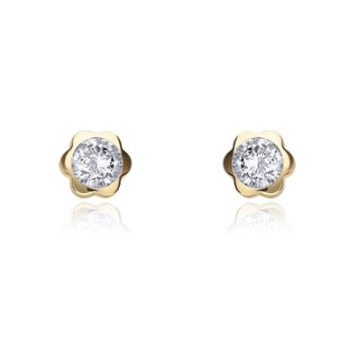 Pendientes para bebé en oro amarillo de 1ª ley 750 mls , modelo flor mini con circonita blanca medida 3.80x3.80 mm y cierre en rosca