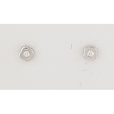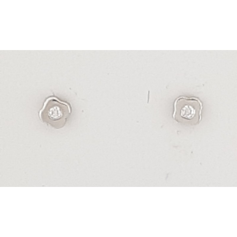 Pendientes para bebé en oro blanco de 1ª ley 750 mls , modelo flor cuatro petalos mini con circonita blanca medida 3,50x3,50 mm y cierre en rosca
