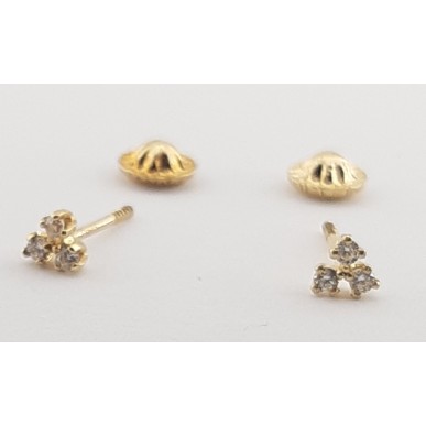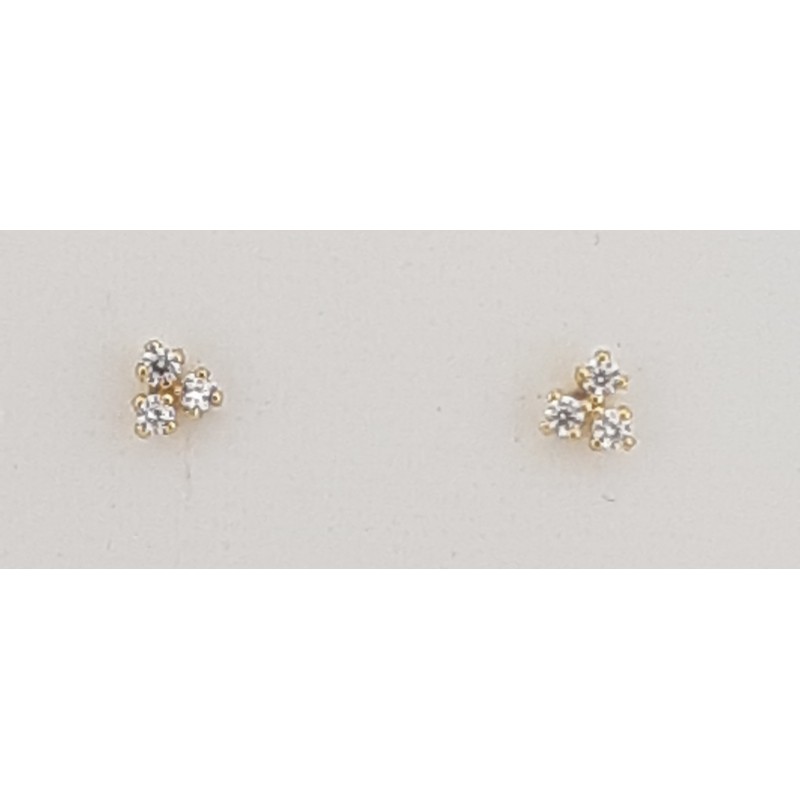 Pendientes fabricados en oro amarillo de 18 kilates (750 milésimas). Pendientes de tipo dormilona compuestos por tres circonitas blancas de talla brillante engastadas en cuatro garras y en forma de trebol , miden 3,60 mm. y con cierre de rosca.