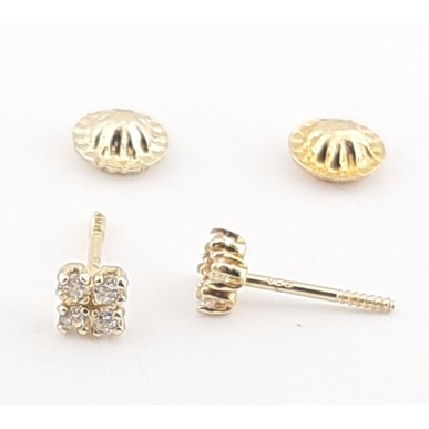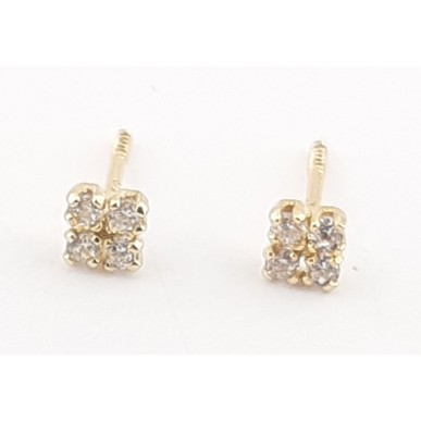 Pendientes fabricados en oro amarillo de 18 kilates (750 milésimas). Pendientes de tipo dormilona compuestos por cuatro circonitas blancas de talla brillante engastadas en cuatro garras y en forma cuadradas , miden 3,60x3,60mm. y con cierre de rosca.