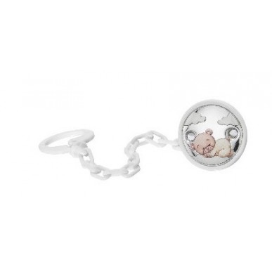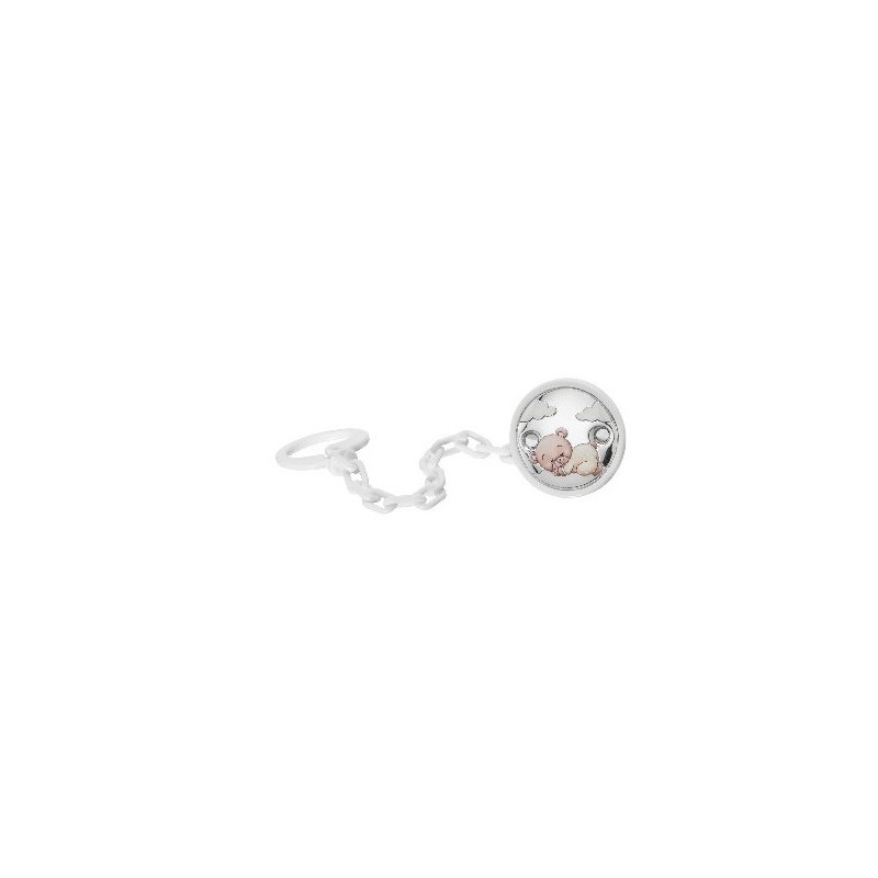 Pinza chupete modelo OSO DURMIENDO . Revestido en plata con tecnología PVD conforme a la normativa de ley vigente . Pinza trasera de plástico blanco y cadena de plástico del mismo color. Lacada para evitar alergias y con dos orificios para evitar la asfixia en caso de accidente.