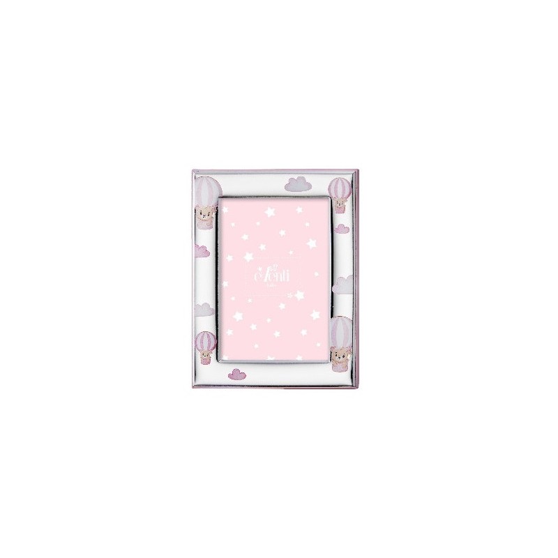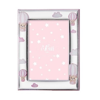 Portafotos infantil con adornos de osos ,globos y lacado en color rosa y parte trasera en madera pintada de color rosa ,revestido en plata con tecnología PVD conforme a la normativa de ley vigente,