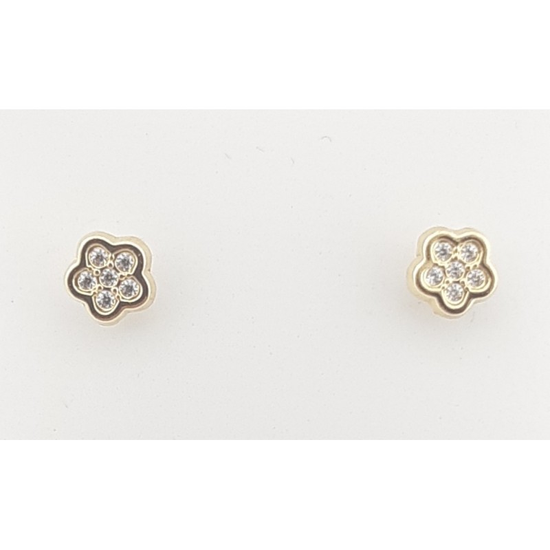 Pendientes para bebé en oro amarillo de 1ª ley 750 mls , modelo flor con circonita blanca medida 4,40x4.40 mm y cierre en rosca