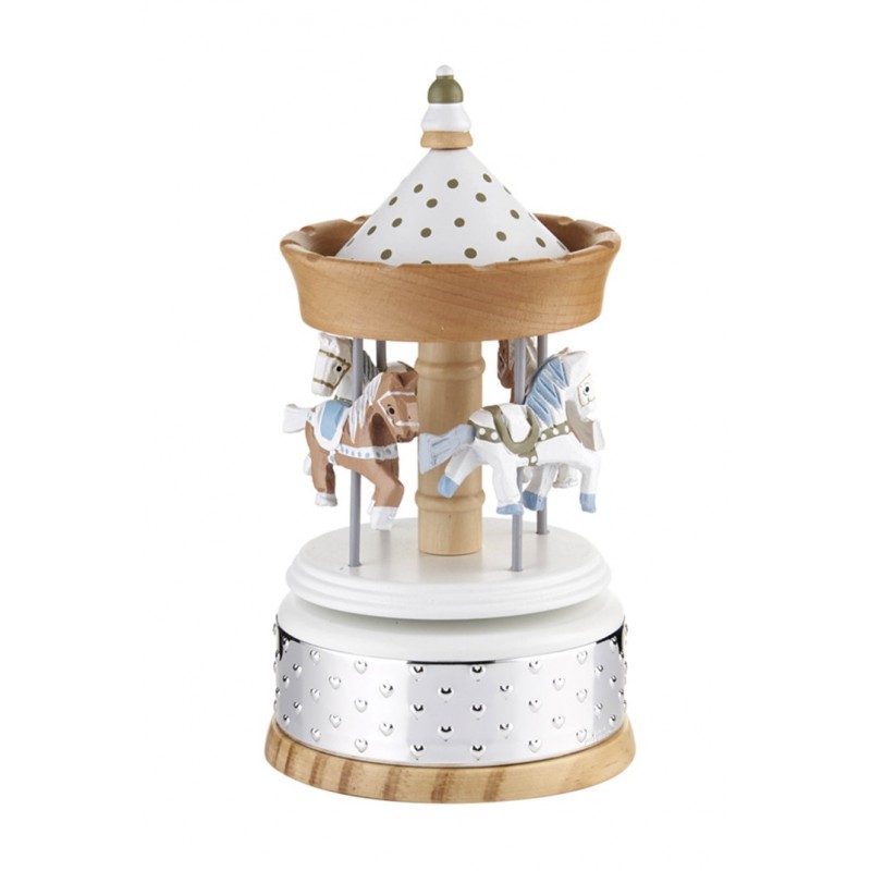 Carrousel musical bebé en madera y la base una lamina con corazones bilaminado en plata . Un regalo ideal para hacer dormir a los más pequeños, creando una decoración única. Para hacerlo sonar simplemente tienes que darle unas vueltas con la mano y al soltarlo empezará a girar y a hacer sonar una bonita canción de de cuna.