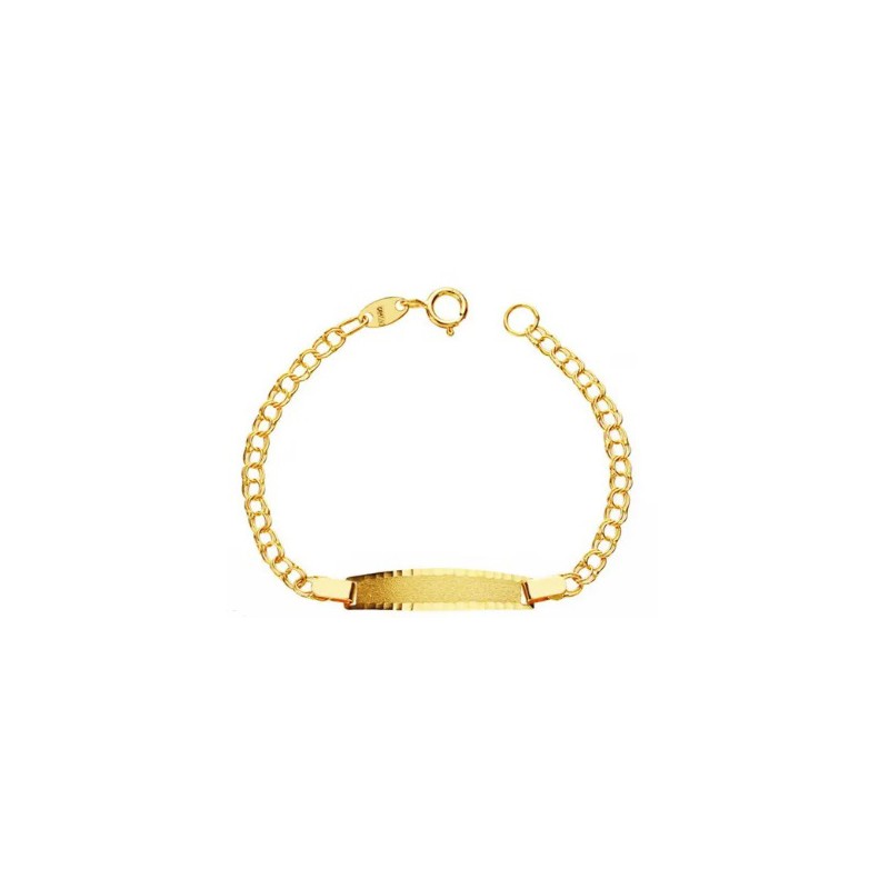 Pulsera para bebé modelo nomeolvides en oro amarillo de 1ª ley 18ktes 750mls medida de largo 12cm , la plaquita se puede grabar y la medida es de 17x4.4mm. cierre de reasa.