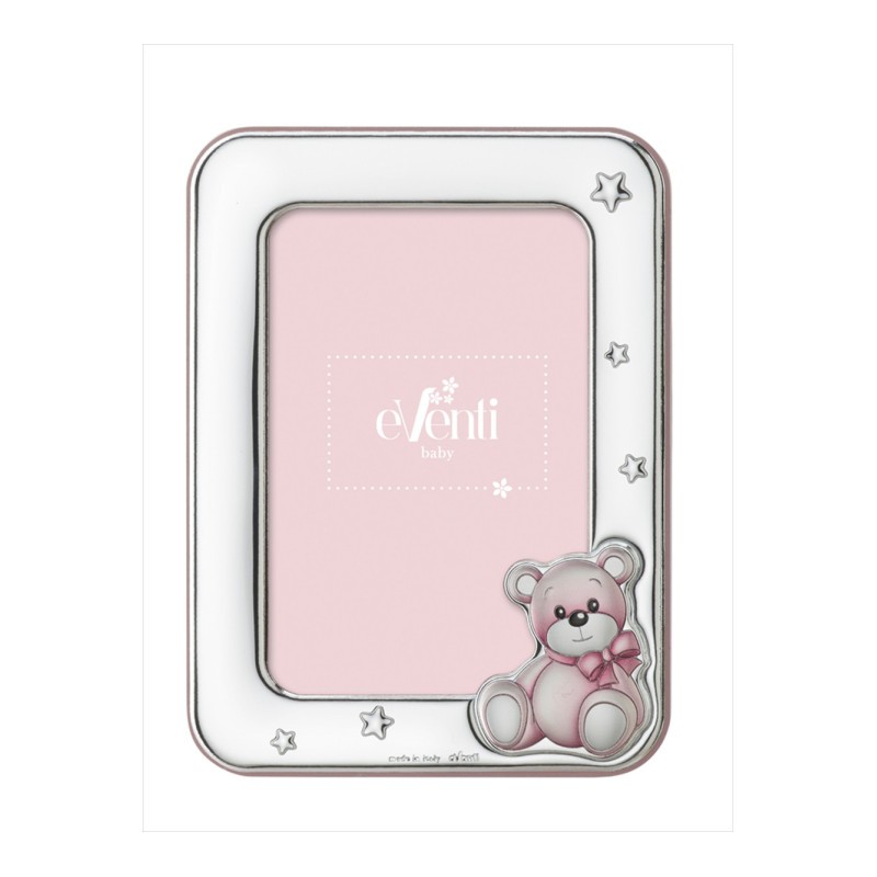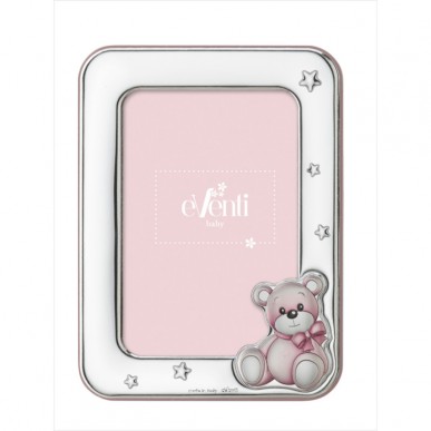 Portafotos infantil con adornos de oso con estrellas y lacado en color rosa y parte trasera en madera pintada de color rosa,revestido en plata con tecnología PVD conforme a la normativa de ley vigente,