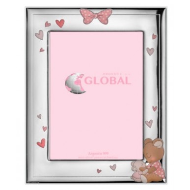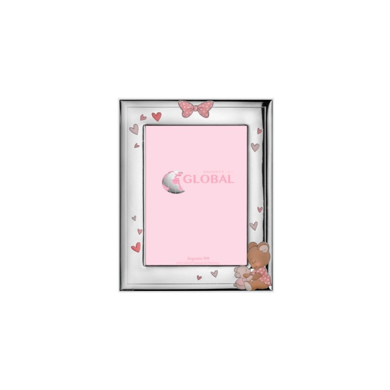 Portafotos infantil con adornos de osos y lacado en color y parte trasera en madera pintada de color blanco,revestido en plata con tecnología PVD conforme a la normativa de ley vigente,