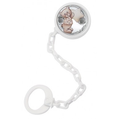 Pinza chupete modelo OSO ESTRELLA . Revestido en plata con tecnología PVD conforme a la normativa de ley vigente . Pinza trasera de plástico blanco y cadena de plástico del mismo color. Lacada para evitar alergias y con dos orificios para evitar la asfixia en caso de accidente.