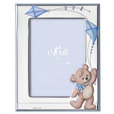 Portafotos infantil con adornos de oso y cometas lacado en colores y parte trasera en madera pintada de color blanco,revestido en plata con tecnología PVD conforme a la normativa de ley vigente,
