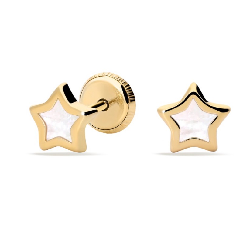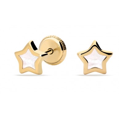 Pendientes realizados en Oro Amarillo de 1ª ley 18 kilates 750mls que tienen un tamaño de 6,10 x 6,10 mm. Su bonito diseño en forma de estrella , está compuesto por un borde realizado en Oro y un interior de delicado nácar. Estos pendientes cuentan con un cierre a rosca i son ideales para bebé.