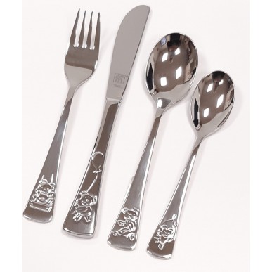 Cubierto fabricado en acero antialérgico e inalterable set de 4 piezas . Con grabados infantiles de ositos en la parte delantera .Su forma está estudiada para que sean perfectos para la boquita del bebé. Estuche de regalo . Personalización gratuíta con el nombre del bebé.