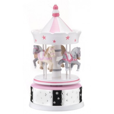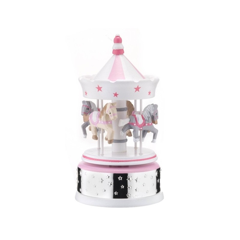 Carrusel musical bebé en madera y la base una lamina con estrellas bilaminado en plata . Un regalo ideal para hacer dormir a los más pequeños, creando una decoración única. Para hacerlo sonar simplemente tienes que darle unas vueltas con la mano y al soltarlo empezará a girar y a hacer sonar una bonita canción de de cuna.