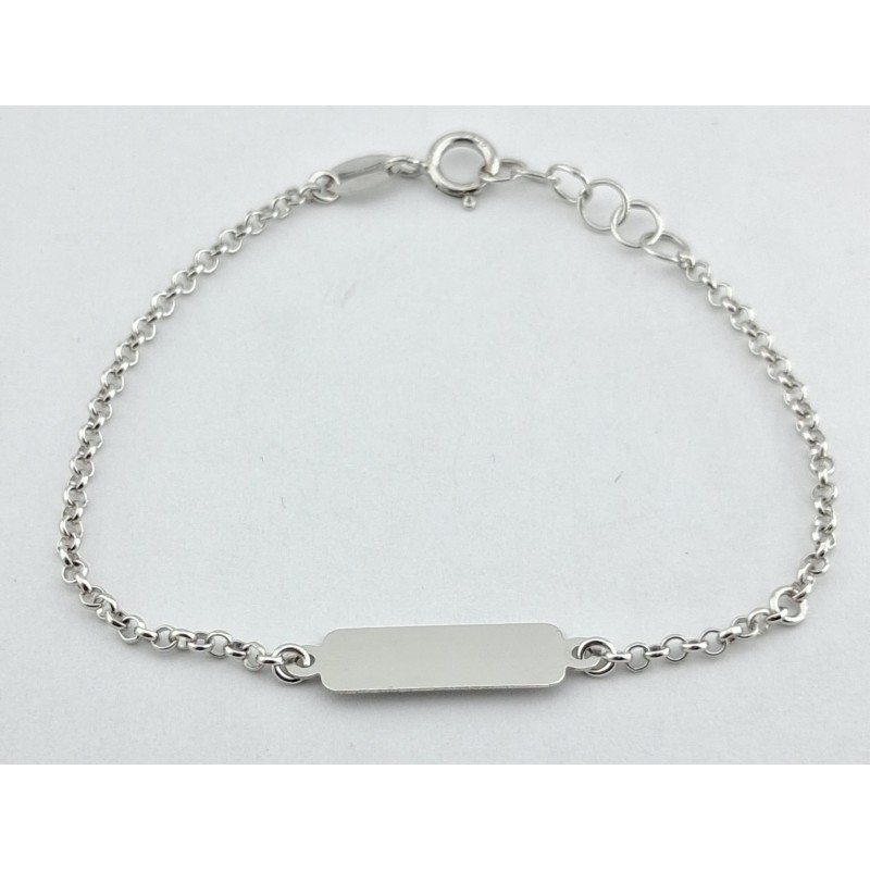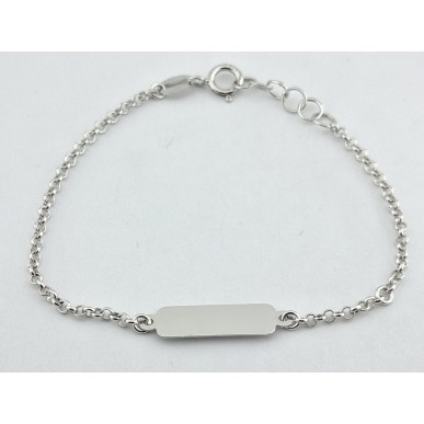 Pulsera para bebé en oro blanco de 1ªley 18 ktes 750mls con plaquita rectangular de medida 13,50x4,80mm , largo ajustble en 12,50 cm y 13,50 cm, eslabones en rulo de 1,65mm de diámetro y cierre con reasa.