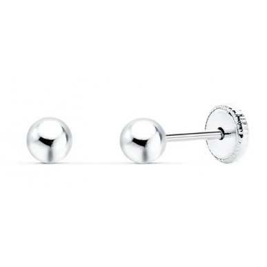 Pendientes para bebé en oro blanco de 1ª ley 18ktes 750 mls , modelo bola lisa de 3,00mm de diámetro y cierre en rosca , para la primera puesta.