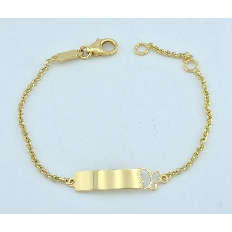 Pulsera para bebé en oro de 1º ley 18ktes 750mls , pulsera con placa rectangular para grabar de medida 12,70x4.30mm y mariposa calada ,largo ajustable en dos medidas de 12cm y 14 cm cierre con mosquetón.