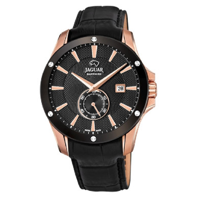 Reloj de hombre, correa de piel en negro, Material de la caja acero inoxidable IP rosa , cuenta con una caja cuyo diámetro es 45mm de forma redonda, la mecanica y movimiento suizo, color del dial en negro, con una resistencia de 100 mts y ancho de la correa de 21,5mm. Garantia 2 años.