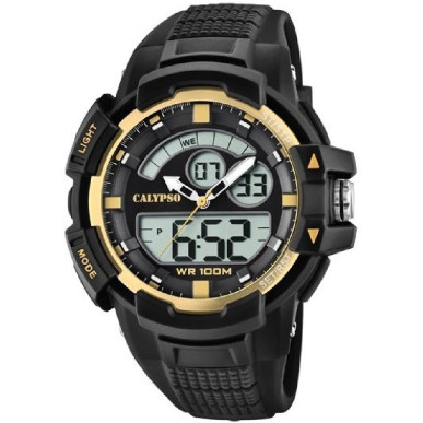 Reloj Calypso Street Style K5767/4 analógico y digital para hombre con movimiento de cuarzo y resistencia al agua de 100 metros.. Se incluye estuche oficial de la marca y con toda la documentación pertinente.Garantia de 2 años. Para Hombre Movimiento Cuarzo Analógico o digital Analógico y Digital Tipo de correa Plástico Tipo de cristal Plástico Diámetro de la caja 53 mm Resistencia al agua (metros) 100 Color del dial Negro Color de la correa Negro Color caja Dorado, Negro Características Agujas luminiscentes, Alarma, Calendario, Cronógrafo,Doble horaio , luz.