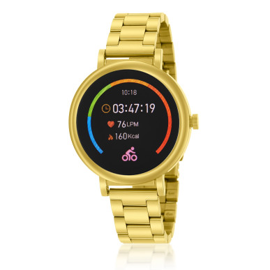 CARACTERÍSTICAS: Pantalla: 1.09 pulgadas Batería: 190 mAh 5-7 días en uso normal más de 15 días en Standby Diámetro caja: 39,60mm. Material Caja: Acero IP Dorado Resistente al agua: IP68