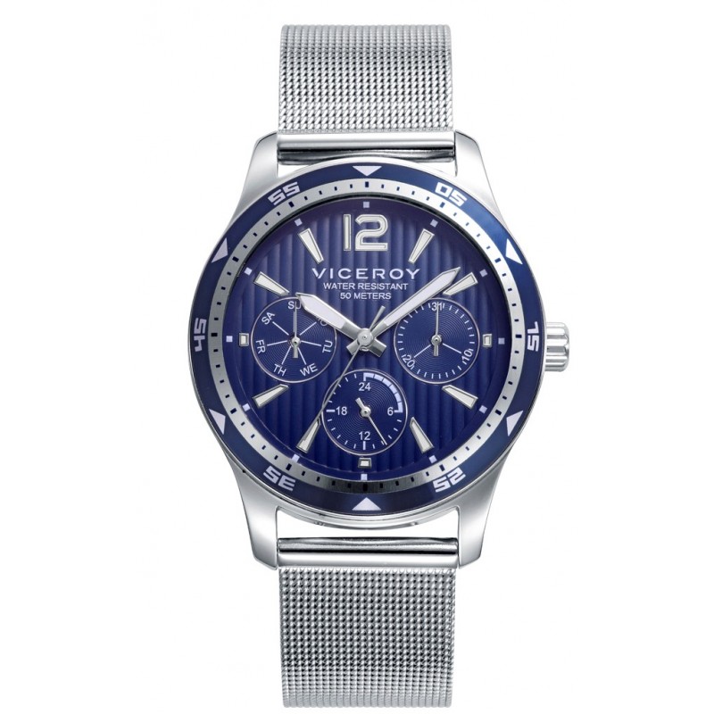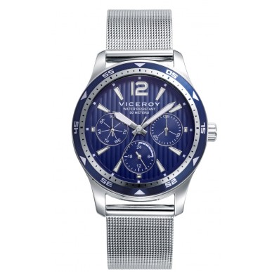 Pack de Niño Viceroy Next, reloj multifunción , caja de acero, esfera azul y malla milanesa con cierre deslizante que permite su ajuste a la muñeca, pulsera de actividad negra. Pack de niño Next reloj multifunción, caja de acero y malla milanesa con pulsera de actividad negra.