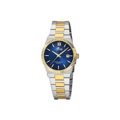 Reloj Lotus para mujer . Se trara de un reloj analógico con movimiento de cuarzo y cristal mineral. El reloj tiene la caja de acero con el bisel en IP dorado , esfera azul fuerte con indices en un toque IP dorado . El tamaño de la caja es de 32 mm de diámetro. Se puede sumergir a 10 ATM y tiene una garantía de 2 años .