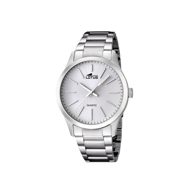 Reloj Lotus para hombre . Se trara de un reloj analógico con movimiento de cuarzo y cristal mineral. El reloj tiene la caja de acero con esfera plateada . El tamaño de la caja es de 42 mm de diámetro. Se puede sumergir a 5 ATM y tiene una garantía de 3 años .
