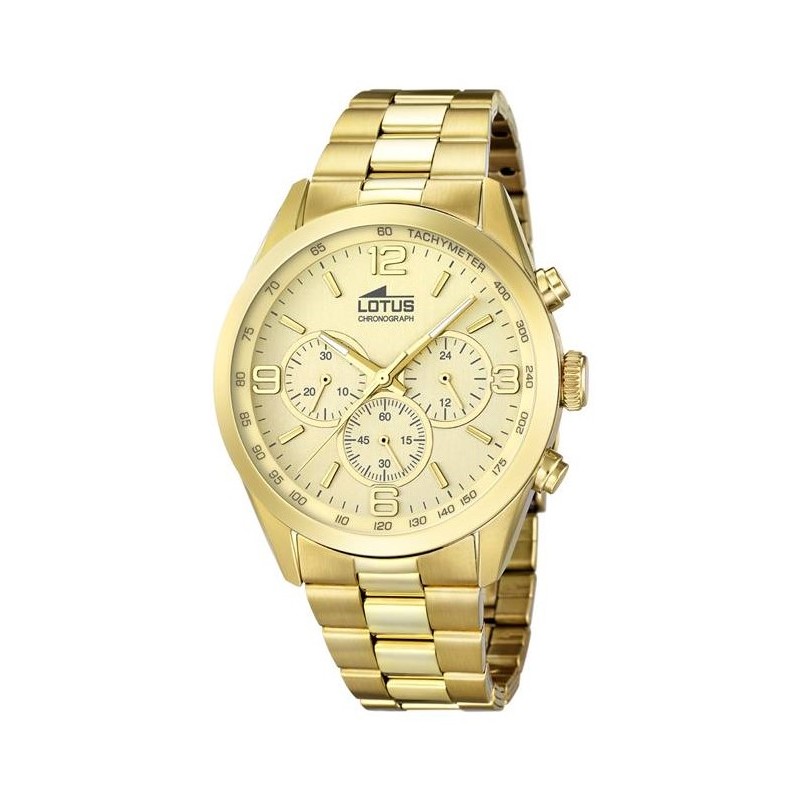 CARACTERISTICAS: Para Hombre Movimiento Cuarzo Funciones Hora, Cronógrafo. Tipo de correa Acero con IP Dorado Tipo de cristal Mineral Diámetro de la caja 43,50 mm Resistencia al agua (metros) 50 Color del dial en dorado Color de la correa IP dorado y cierre desplegable Color caja IP dorado Garantia de 3 años