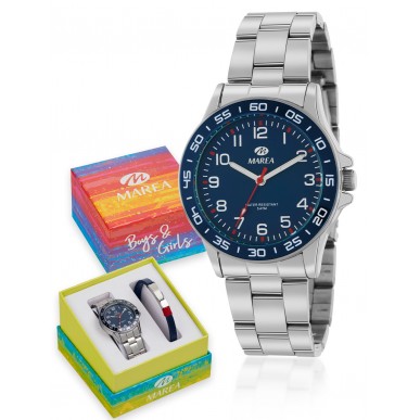 Reloj Marea kids - Pack de Niño con reloj tres agujas con caja de acero y correa metalica en acero, esfera azul con números arabes y con bisel en bicolor y pulsera de piel en acero pulido.