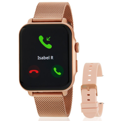 CARACTERÍSTICAS: Pantalla táctil: 1.69 pulgadas. Batería: 260 mAh. 3-5 días en uso normal. Tamaño Caja: 45 x 35 mm. Material Caja: Plástico color acero. Material Brazalete: Acero y correa extra de silicona color rosa. Impermeabilidad: IP68.