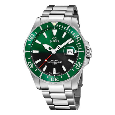 Reloj Jaguar para hombre modelo J860/6. Se trara de un reloj analógico con movimiento de cuarzo y cristal de sapphire y con esfera de color verde/negra , bisel númerado en color verde . El reloj tiene la caja y la correa de acero. El tamaño de la caja es de 44,50 mm de diámetro. Se puede sumergir a 10 ATM y tiene una garantía de 3 años , se envia con caja de lujo Jaguar .