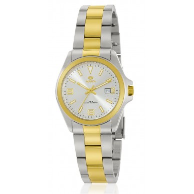 Movimiento japonés: 3 agujas con calendario. Diámetro Caja: 30 mm. Material Caja: Acero con bisel y corona dorados. Material Brazalete: Acero con detalles dorados. Esfera: Color plateado con agujas e índices dorados. Resistente al agua: 5 ATM