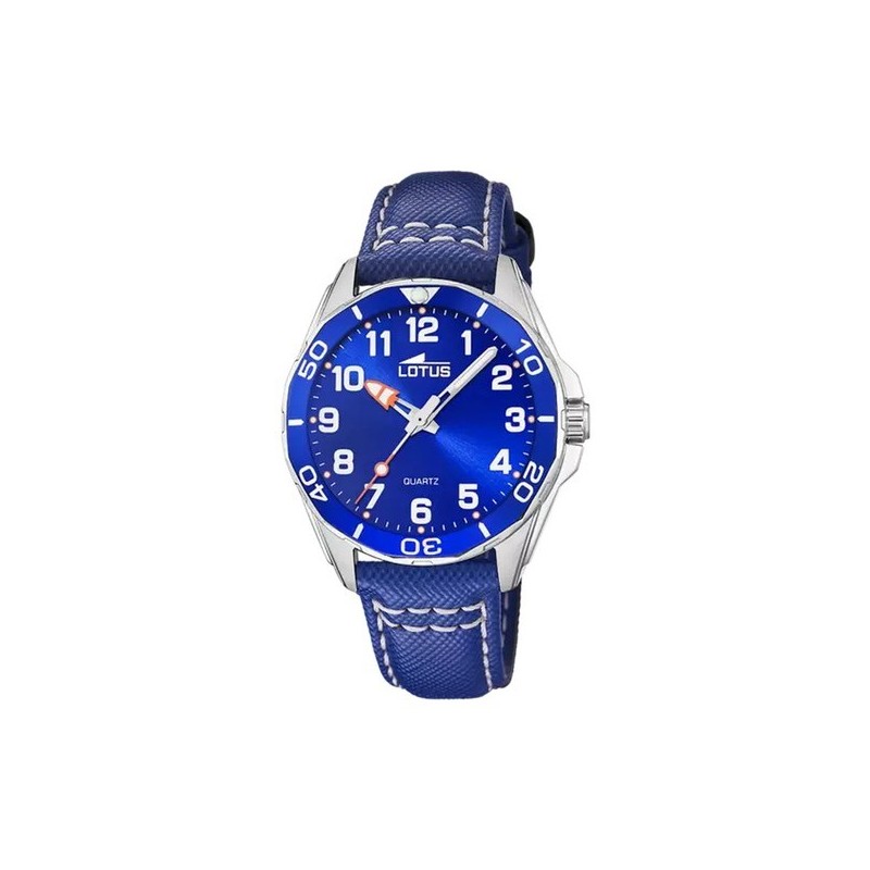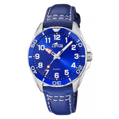 Reloj Lotus Infantil 18861/1 Piel Azul. Caja de acero inoxidable de 36mm de diametro. Correa de piel azul. Cierre de hebilla. Bisel y esfera azul. Tres agujas. Cristal mineral. Movimiento quartz. Sumergible 50m. 3 años de garantía. Ref 18861/1