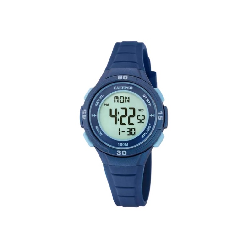 Reloj Calypso K5830/5 digital para niño con movimiento de cuarzo, correa de caucho y resistencia al agua de 100 metros. Se incluye estuche oficial de la marca y con toda la documentación pertinente. Para Niño Movimiento Cuarzo Digital Tipo de correa Caucho Tipo de cristal Plexiglass Diámetro de la caja 34,00 mm Resistencia al agua (metros) 100 Color del dial Gris Color de la correa azul Características Hora, Alarma, Calendario, Cronógrafo,Doble horaio , luz. Garantia de 3 años