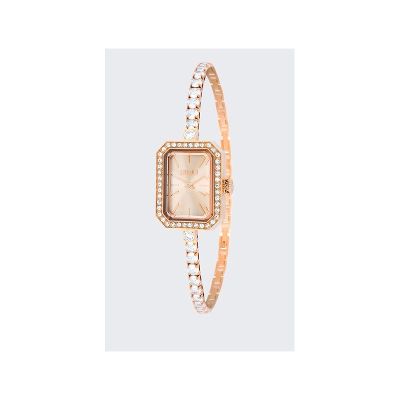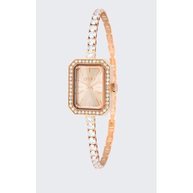 Reloj con caja de acero y cristales Galvánico color oro rosa Esfera color oro rosa Pulsera fina con cristales Cierre desplegable Medidas de la caja: 20 x 26 mm Movimiento de cuarzo Seiko Cal. VJ20 Impermeable a 3 atmósferas Composición: 100 % acero inoxidable Garantia de 3 años