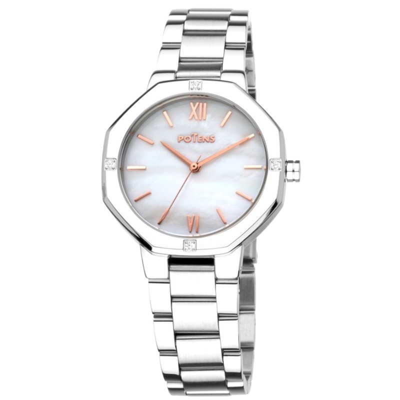 FICHA TÉCNICA Caja de acero con cuatro circonitas blancas Calendario no Cierre desplegable Correa metalica de acero Cristal mineral Funciones analogico con tres agujas Sumergible 50 mts Tamaño octogonal 32,70x32,70 mm Esfera de nacar con indices en rosé