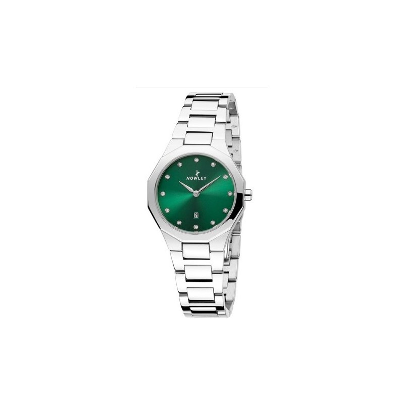 Caja de metal plateado Tapa de fondo en acero Esfera verde , indices con piedras circonitas blancas Correa de acero Cierre oculto con pulsadores Medida 32 mm de diámetro Impermeable a 30 mts Cristal mineral Funciones hora , minutos y calendario Garantia de 3 años