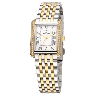 FICHA TÉCNICA Caja de acero con IP bicolor circonitas blancas Calendario no Cierre desplegable Correa metalica de acero con IP bicolor Cristal mineral Funciones analogico con tres agujas Sumergible 50 mts Tamaño rectangular 24,50x31,00x7,50 mm Esfera plateada con números romanos en negro