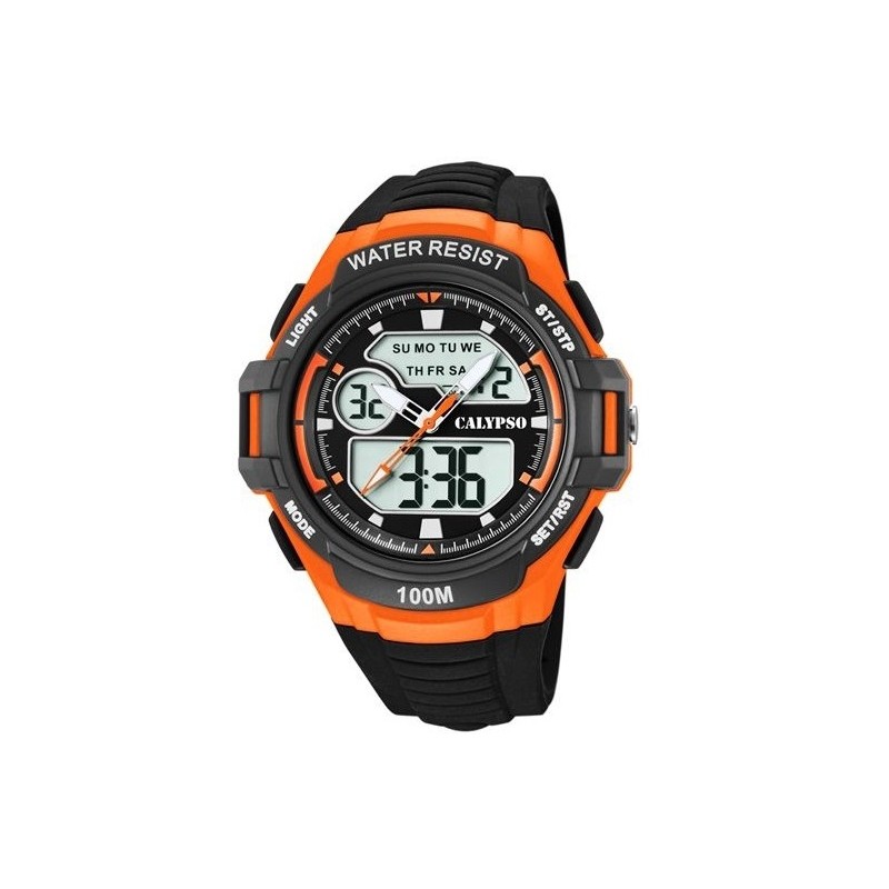 Reloj Calypso Street Style K5770/2 analógico y digital para hombre con movimiento de cuarzo y resistencia al agua de 100 metros.. Se incluye estuche oficial de la marca y con toda la documentación pertinente.Garantia de 3 años. Para Hombre Movimiento Cuarzo Analógico o digital Analógico y Digital Tipo de correa Plástico Tipo de cristal Plástico Diámetro de la caja 50mm Resistencia al agua (metros) 100 Color del dial Negro Color de la correa Negro Color caja Naranja / Negro Características Agujas luminiscentes, Alarma, Calendario, Cronógrafo,Doble horaio , luz.