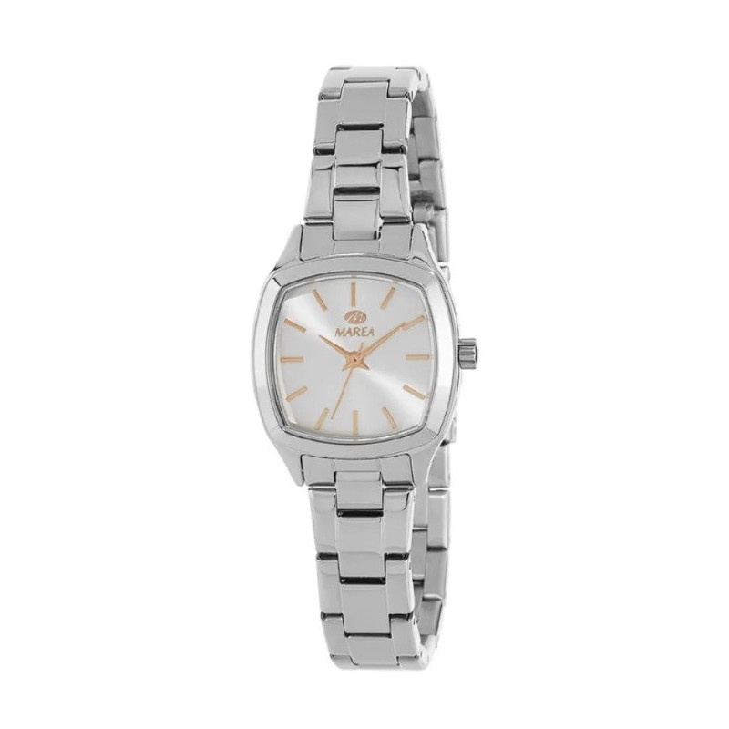 Movimiento japonés: 3 agujas Diámetro Caja: 27,50x27,50mm Material Caja: Metal . Material Brazalete: Acero Esfera: Color plateado con agujas e índices rosé. Resistente al agua: 53ATM