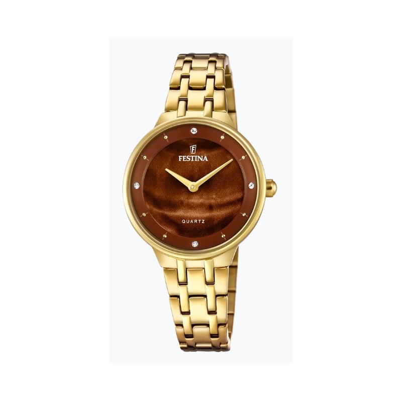 La caja redonda de este reloj Festina es de acero inoxidable dorado y la esfera de color marrón es de cristal mineral para garantizar la durabilidad en su uso diario. El cristal mineral, también ofrece la resistencia necesaria a los arañazos que pueda sufrir durante el día a día. El movimiento de cuarzo es preciso, garantizando la precisión necesaria.