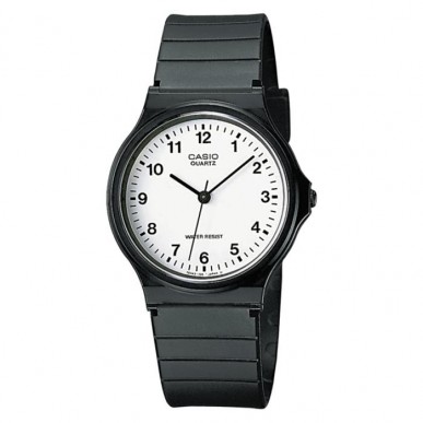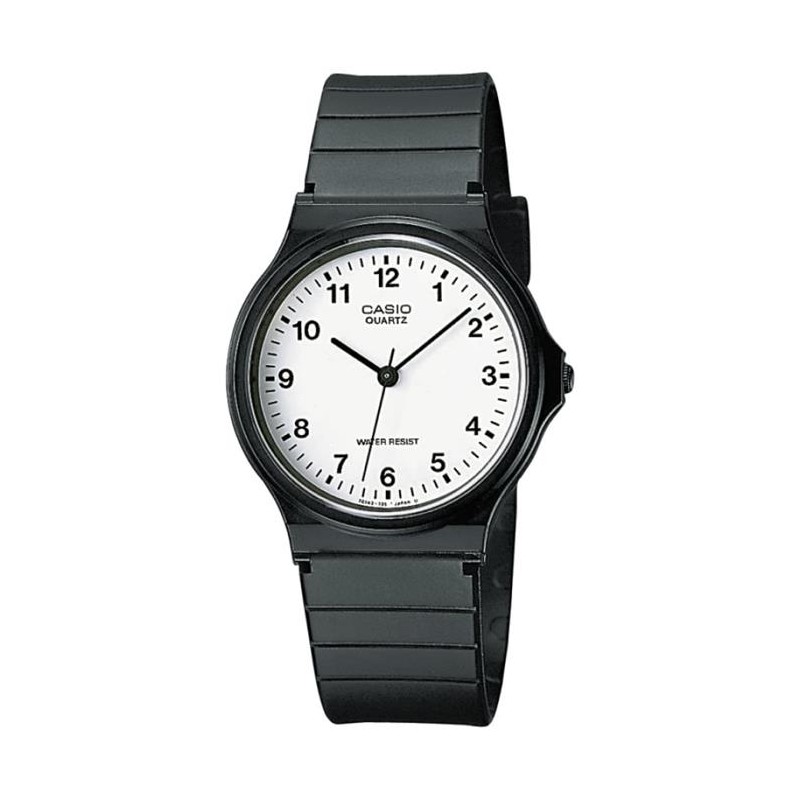 Reloj Casio para hombre fabricado en resina en color negro. Se trata de un reloj de diseño clásico y atemporal con caja de resina en color negro de 33,8mm de diámetro con esfera blanca que contiene índices y agujas en color negro movidas por mecanismo de cuarzo analógico protegido por cristal acrílico. Su correa es de resina con cierre de hebilla. Resistente a salpicaduras de agua.