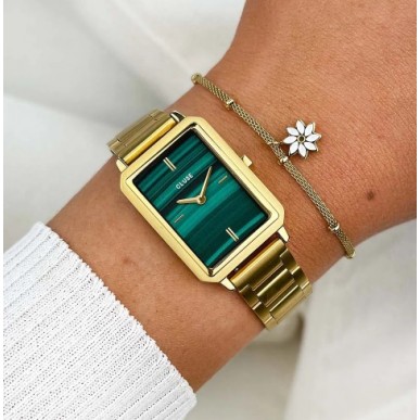 El reloj rectangular para mujer Fluette tiene una caja dorada de 30.6 mm, una esfera verde y una correa de acero inoxidable de 14 mm dorada.